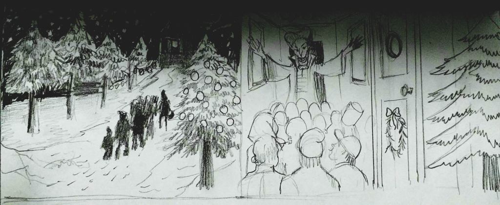 Once they got in front of the house the villagers preened, coughed, and started caroling. The priest starts: