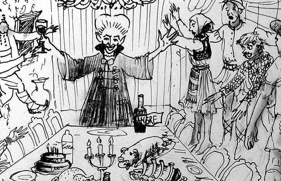 Dracula snaps his fingers at once and a table full of treats shows up: chocolate-covered fruits, jellies, juices from every fruit and a beautiful multi-tiered honey cake called Albiniƫa. The children rushed to the sweets.