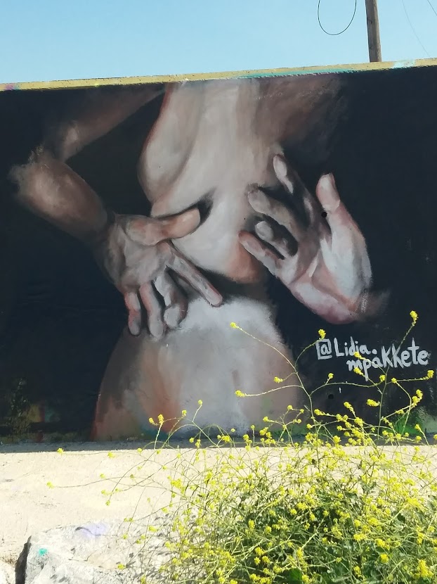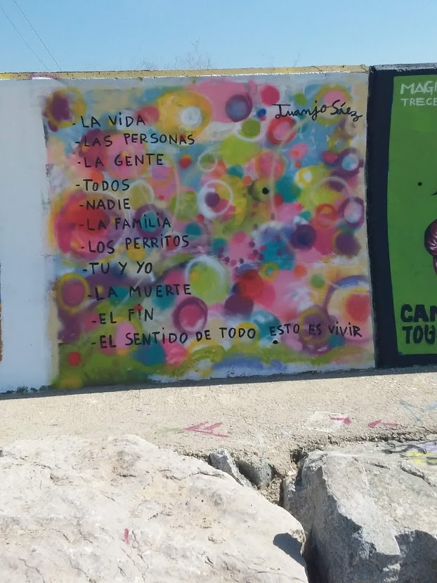 All kinds of mural paintings, a wall of colors. In lateral, there is a big semi-nude graffiti of Varuna, the Hindu goddess of oceans and water, this time represented as a woman, art work signed by agua_maga. A man stands nearby, face towards the sea, I take no picture yet, he friezes and looks at me. I smile and say ¨Hola¨. The man smiles back quite shy and continues what he was doing that was not illegal or strange at all. He had a stone attached to one hand, attached with a piece of fabric that must be hold tide: improvised dumbbells, fitness alternative. He was actually doing the same thing as the muscular men do in the gym, but with a rock. I kindly smiled and said: ¨Nice invention¨ and continued my wall exploration. Big up to all those people not giving up and finding ways, even if the means are lacking.