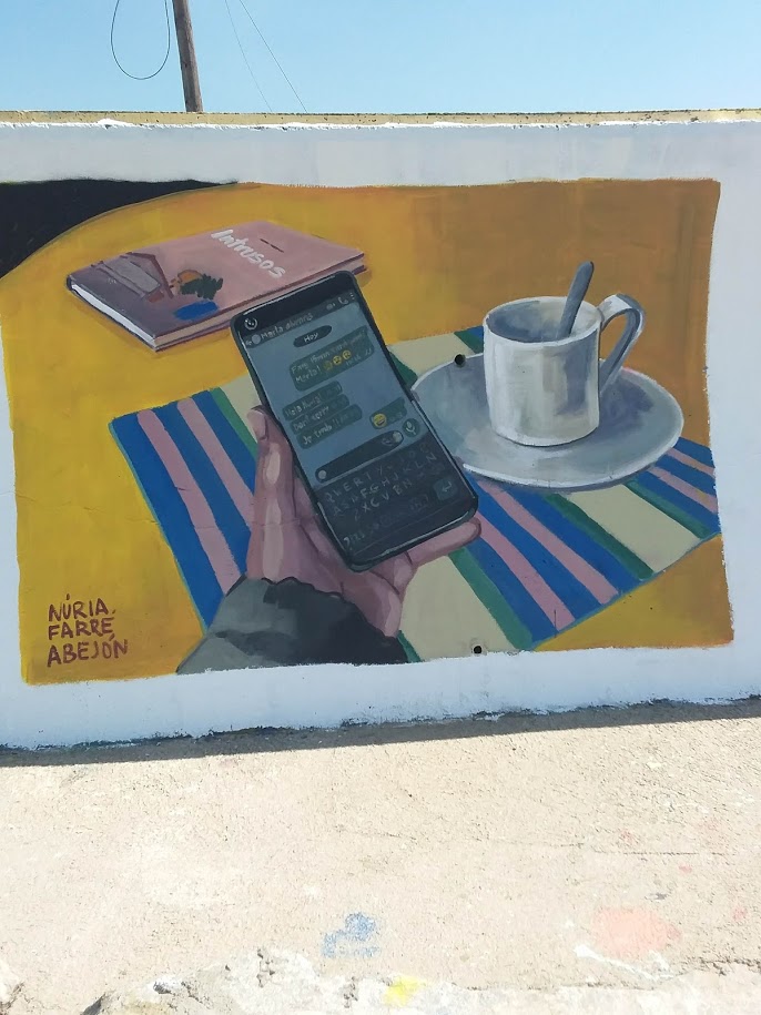 Nuria Farre Abejon – ¨Intrusos¨, realist painting showing that the frame in frame narrative idea, well known from Geoffrey Chaucer’s ¨The Canterbury Tales¨ is now present in our quotidian life, with the existence of books and social media. ¨Intruders¨ is also an ufology book, based on a family´s case of abductions. Mystery is nice, yet in this mural-painting the alien presence is suggested by texting, an uncomfortable alien, extra presence can as well be a human, someone you know, that just by sending text-messages can take advantage. Sometimes the manipulation is not so obvious, it is well encrypted in the written language and from the written language it can be revealed, that is, decoded. The math is nice, it works well for quantities, but the important content, the sap tree is the text.