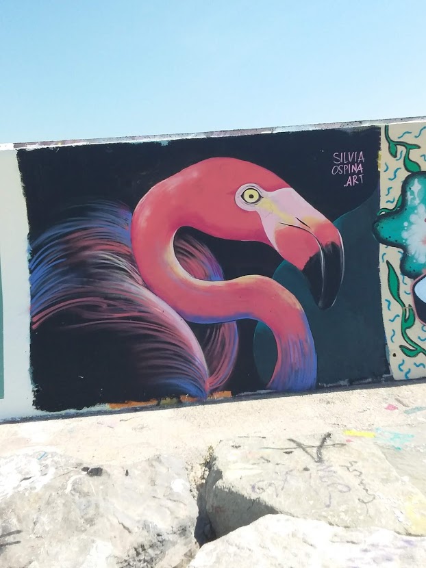 It’s so windy, reading was difficult. I take my things, put on my mask and take a walk, massaging my feet with every step I take on the golden sand. In the distance I see the paintings, lined up on a large wall, leading from the beach towards the sea. Wow, I’ve reached the Forum area. I thought it wasn’t that far away. An attractive sight. I’m going fast, I feel it, but actually walking on the sand makes me very slow. To get to the wall you have to climb some big rocks and to my surprise, in spring, flowers bloom among these rocks. A beauty.